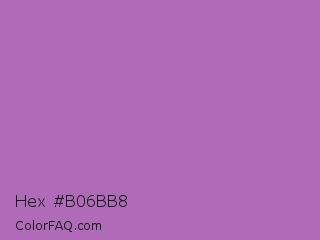 Hex #b06bb8 Color is a normal magenta color and the nearest color is Pearly Purple #b768a2. Hex code #b06bb8 and RGB value is rgb(176,107,184). In RGB color space, this color is composed of 69% red, 42% green, 72% blue, In CMYK color space, this color is composed of 4% cyan, 42% magenta, 0% yellow , 28% black , In HSL color space, this color has a hue angle of 294° , 35% saturation and 57% lightness.