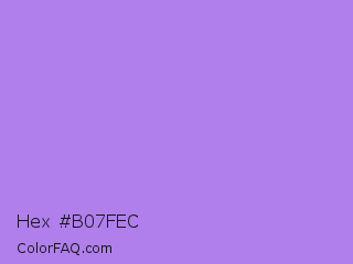 Hex #b07fec Color is a light violet color and the nearest color is Lavender #b57edc. Hex code #b07fec and RGB value is rgb(176,127,236). In RGB color space, this color is composed of 69% red, 50% green, 93% blue, In CMYK color space, this color is composed of 25% cyan, 46% magenta, 0% yellow , 7% black , In HSL color space, this color has a hue angle of 267° , 74% saturation and 71% lightness.