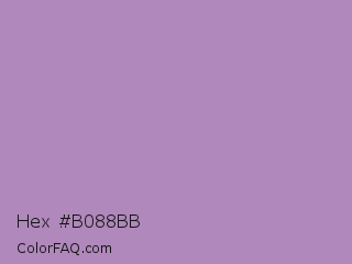 Hex #b088bb Color is a light purple color and the nearest color is African Violet #b284be. Hex code #b088bb and RGB value is rgb(176,136,187). In RGB color space, this color is composed of 69% red, 53% green, 73% blue, In CMYK color space, this color is composed of 6% cyan, 27% magenta, 0% yellow , 27% black , In HSL color space, this color has a hue angle of 287° , 27% saturation and 63% lightness.
