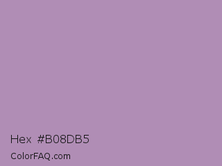 Hex #b08db5 Color is a light magenta color and the nearest color is Glossy Grape #ab92b3. Hex code #b08db5 and RGB value is rgb(176,141,181). In RGB color space, this color is composed of 69% red, 55% green, 71% blue, In CMYK color space, this color is composed of 3% cyan, 22% magenta, 0% yellow , 29% black , In HSL color space, this color has a hue angle of 293° , 21% saturation and 63% lightness.