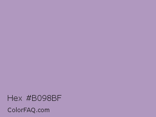 Hex #b098bf Color is a light purple color and the nearest color is Pastel Purple #b39eb5. Hex code #b098bf and RGB value is rgb(176,152,191). In RGB color space, this color is composed of 69% red, 60% green, 75% blue, In CMYK color space, this color is composed of 8% cyan, 20% magenta, 0% yellow , 25% black , In HSL color space, this color has a hue angle of 277° , 23% saturation and 67% lightness.