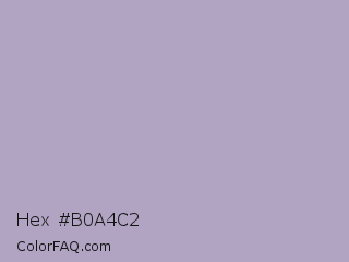 Hex #b0a4c2 Color is a light violet color and the nearest color is Logan #aaa9cd. Hex code #b0a4c2 and RGB value is rgb(176,164,194). In RGB color space, this color is composed of 69% red, 64% green, 76% blue, In CMYK color space, this color is composed of 9% cyan, 15% magenta, 0% yellow , 24% black , In HSL color space, this color has a hue angle of 264° , 20% saturation and 70% lightness.