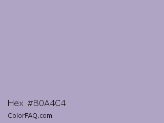 Hex #b0a4c4 Color is a light violet color and the nearest color is Logan #aaa9cd. Hex code #b0a4c4 and RGB value is rgb(176,164,196). In RGB color space, this color is composed of 69% red, 64% green, 77% blue, In CMYK color space, this color is composed of 10% cyan, 16% magenta, 0% yellow , 23% black , In HSL color space, this color has a hue angle of 263° , 21% saturation and 71% lightness.