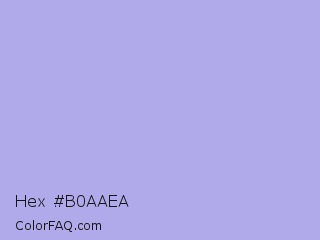 Hex #b0aaea Color is a light indigo color and the nearest color is Maximum Blue Purple #acace6. Hex code #b0aaea and RGB value is rgb(176,170,234). In RGB color space, this color is composed of 69% red, 67% green, 92% blue, In CMYK color space, this color is composed of 25% cyan, 27% magenta, 0% yellow , 8% black , In HSL color space, this color has a hue angle of 246° , 60% saturation and 79% lightness.