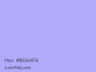 Hex #b0aafa Color is a very light indigo color and the nearest color is Biloba Flower #b2a1ea. Hex code #b0aafa and RGB value is rgb(176,170,250). In RGB color space, this color is composed of 69% red, 67% green, 98% blue, In CMYK color space, this color is composed of 30% cyan, 32% magenta, 0% yellow , 2% black , In HSL color space, this color has a hue angle of 245° , 89% saturation and 82% lightness.