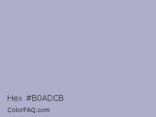 Hex #b0adcb Color is a light indigo color and the nearest color is Logan #aaa9cd. Hex code #b0adcb and RGB value is rgb(176,173,203). In RGB color space, this color is composed of 69% red, 68% green, 80% blue, In CMYK color space, this color is composed of 13% cyan, 15% magenta, 0% yellow , 20% black , In HSL color space, this color has a hue angle of 246° , 22% saturation and 74% lightness.