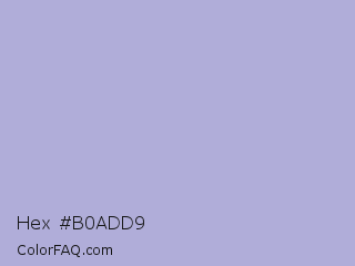 Hex #b0add9 Color is a light indigo color and the nearest color is Maximum Blue Purple #acace6. Hex code #b0add9 and RGB value is rgb(176,173,217). In RGB color space, this color is composed of 69% red, 68% green, 85% blue, In CMYK color space, this color is composed of 19% cyan, 20% magenta, 0% yellow , 15% black , In HSL color space, this color has a hue angle of 244° , 37% saturation and 76% lightness.