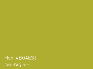 Hex #b0ae31 Color is a normal yellow color and the nearest color is Brass #b5a642. Hex code #b0ae31 and RGB value is rgb(176,174,49). In RGB color space, this color is composed of 69% red, 68% green, 19% blue, In CMYK color space, this color is composed of 0% cyan, 1% magenta, 72% yellow , 31% black , In HSL color space, this color has a hue angle of 59° , 56% saturation and 44% lightness.