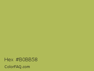 Hex #b0bb58 Color is a normal yellow color and the nearest color is Middle Green Yellow #acbf60. Hex code #b0bb58 and RGB value is rgb(176,187,88). In RGB color space, this color is composed of 69% red, 73% green, 35% blue, In CMYK color space, this color is composed of 6% cyan, 0% magenta, 53% yellow , 27% black , In HSL color space, this color has a hue angle of 67° , 42% saturation and 54% lightness.