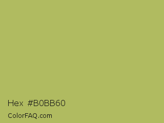 Hex #b0bb60 Color is a normal yellow color and the nearest color is Middle Green Yellow #acbf60. Hex code #b0bb60 and RGB value is rgb(176,187,96). In RGB color space, this color is composed of 69% red, 73% green, 38% blue, In CMYK color space, this color is composed of 6% cyan, 0% magenta, 49% yellow , 27% black , In HSL color space, this color has a hue angle of 67° , 40% saturation and 55% lightness.