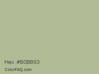 Hex #b0bb93 Color is a light lime color and the nearest color is Swamp Green #acb78e. Hex code #b0bb93 and RGB value is rgb(176,187,147). In RGB color space, this color is composed of 69% red, 73% green, 58% blue, In CMYK color space, this color is composed of 6% cyan, 0% magenta, 21% yellow , 27% black , In HSL color space, this color has a hue angle of 77° , 23% saturation and 65% lightness.