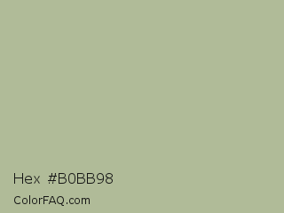 Hex #b0bb98 Color is a light lime color and the nearest color is Laurel Green #a9ba9d. Hex code #b0bb98 and RGB value is rgb(176,187,152). In RGB color space, this color is composed of 69% red, 73% green, 60% blue, In CMYK color space, this color is composed of 6% cyan, 0% magenta, 19% yellow , 27% black , In HSL color space, this color has a hue angle of 79° , 20% saturation and 66% lightness.