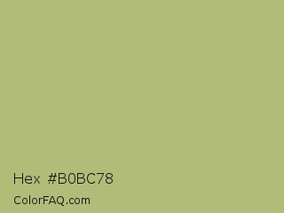 Hex #b0bc78 Color is a normal lime color and the nearest color is Misty Moss #bbb477. Hex code #b0bc78 and RGB value is rgb(176,188,120). In RGB color space, this color is composed of 69% red, 74% green, 47% blue, In CMYK color space, this color is composed of 6% cyan, 0% magenta, 36% yellow , 26% black , In HSL color space, this color has a hue angle of 71° , 34% saturation and 60% lightness.