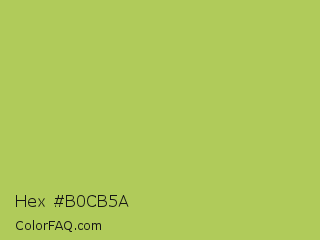 Hex #b0cb5a Color is a normal lime color and the nearest color is Celery #b8c25d. Hex code #b0cb5a and RGB value is rgb(176,203,90). In RGB color space, this color is composed of 69% red, 80% green, 35% blue, In CMYK color space, this color is composed of 13% cyan, 0% magenta, 56% yellow , 20% black , In HSL color space, this color has a hue angle of 74° , 52% saturation and 57% lightness.