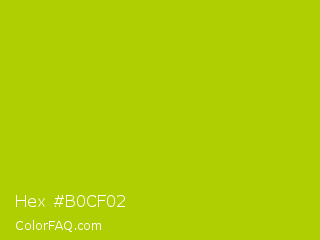 Hex #b0cf02 Color is a normal yellow color and the nearest color is Rio Grande #bbd009. Hex code #b0cf02 and RGB value is rgb(176,207,2). In RGB color space, this color is composed of 69% red, 81% green, 1% blue, In CMYK color space, this color is composed of 15% cyan, 0% magenta, 99% yellow , 19% black , In HSL color space, this color has a hue angle of 69° , 98% saturation and 41% lightness.