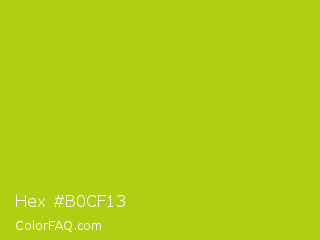 Hex #b0cf13 Color is a normal yellow color and the nearest color is Bahia #a5cb0c. Hex code #b0cf13 and RGB value is rgb(176,207,19). In RGB color space, this color is composed of 69% red, 81% green, 7% blue, In CMYK color space, this color is composed of 15% cyan, 0% magenta, 91% yellow , 19% black , In HSL color space, this color has a hue angle of 70° , 83% saturation and 44% lightness.