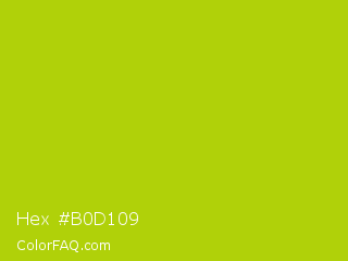 Hex #b0d109 Color is a normal yellow color and the nearest color is Rio Grande #bbd009. Hex code #b0d109 and RGB value is rgb(176,209,9). In RGB color space, this color is composed of 69% red, 82% green, 4% blue, In CMYK color space, this color is composed of 16% cyan, 0% magenta, 96% yellow , 18% black , In HSL color space, this color has a hue angle of 70° , 92% saturation and 43% lightness.