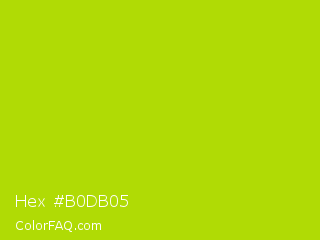 Hex #b0db05 Color is a normal lime color and the nearest color is Vivid Lime Green #a6d608. Hex code #b0db05 and RGB value is rgb(176,219,5). In RGB color space, this color is composed of 69% red, 86% green, 2% blue, In CMYK color space, this color is composed of 20% cyan, 0% magenta, 98% yellow , 14% black , In HSL color space, this color has a hue angle of 72° , 96% saturation and 44% lightness.