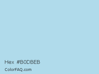Hex #b0dbeb Color is a very light blue color and the nearest color is Light Blue #add8e6. Hex code #b0dbeb and RGB value is rgb(176,219,235). In RGB color space, this color is composed of 69% red, 86% green, 92% blue, In CMYK color space, this color is composed of 25% cyan, 7% magenta, 0% yellow , 8% black , In HSL color space, this color has a hue angle of 196° , 60% saturation and 81% lightness.