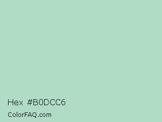 Hex #b0dcc6 Color is a light green color and the nearest color is Fringy Flower #b1e2c1. Hex code #b0dcc6 and RGB value is rgb(176,220,198). In RGB color space, this color is composed of 69% red, 86% green, 78% blue, In CMYK color space, this color is composed of 20% cyan, 0% magenta, 10% yellow , 14% black , In HSL color space, this color has a hue angle of 150° , 39% saturation and 78% lightness.