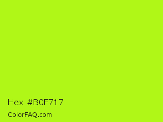 Hex #b0f717 Color is a normal lime color and the nearest color is Inch Worm #b0e313. Hex code #b0f717 and RGB value is rgb(176,247,23). In RGB color space, this color is composed of 69% red, 97% green, 9% blue, In CMYK color space, this color is composed of 29% cyan, 0% magenta, 91% yellow , 3% black , In HSL color space, this color has a hue angle of 79° , 93% saturation and 53% lightness.