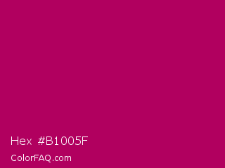 Hex #b1005f Color is a normal rose color and the nearest color is Lipstick #ab0563. Hex code #b1005f and RGB value is rgb(177,0,95). In RGB color space, this color is composed of 69% red, 0% green, 37% blue, In CMYK color space, this color is composed of 0% cyan, 100% magenta, 46% yellow , 31% black , In HSL color space, this color has a hue angle of 328° , 100% saturation and 35% lightness.