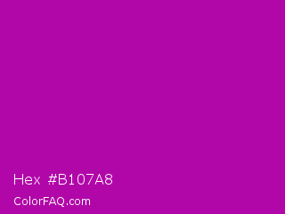Hex #b107a8 Color is a normal magenta color and the nearest color is Heliotrope Magenta #aa00bb. Hex code #b107a8 and RGB value is rgb(177,7,168). In RGB color space, this color is composed of 69% red, 3% green, 66% blue, In CMYK color space, this color is composed of 0% cyan, 96% magenta, 5% yellow , 31% black , In HSL color space, this color has a hue angle of 303° , 92% saturation and 36% lightness.