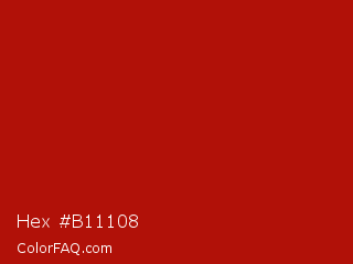 Hex #b11108 Color is a normal red color and the nearest color is Milano Red #b81104. Hex code #b11108 and RGB value is rgb(177,17,8). In RGB color space, this color is composed of 69% red, 7% green, 3% blue, In CMYK color space, this color is composed of 0% cyan, 90% magenta, 95% yellow , 31% black , In HSL color space, this color has a hue angle of 3° , 91% saturation and 36% lightness.