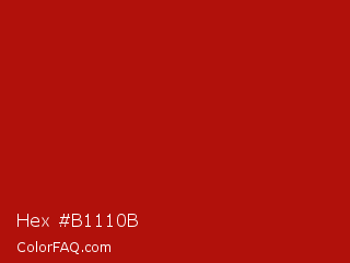 Hex #b1110b Color is a normal red color and the nearest color is Milano Red #b81104. Hex code #b1110b and RGB value is rgb(177,17,11). In RGB color space, this color is composed of 69% red, 7% green, 4% blue, In CMYK color space, this color is composed of 0% cyan, 90% magenta, 94% yellow , 31% black , In HSL color space, this color has a hue angle of 2° , 88% saturation and 37% lightness.