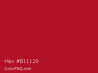 Hex #b11129 Color is a normal red color and the nearest color is Shiraz #b20931. Hex code #b11129 and RGB value is rgb(177,17,41). In RGB color space, this color is composed of 69% red, 7% green, 16% blue, In CMYK color space, this color is composed of 0% cyan, 90% magenta, 77% yellow , 31% black , In HSL color space, this color has a hue angle of 351° , 82% saturation and 38% lightness.