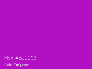 Hex #b111c3 Color is a normal magenta color and the nearest color is Heliotrope Magenta #aa00bb. Hex code #b111c3 and RGB value is rgb(177,17,195). In RGB color space, this color is composed of 69% red, 7% green, 76% blue, In CMYK color space, this color is composed of 9% cyan, 91% magenta, 0% yellow , 24% black , In HSL color space, this color has a hue angle of 294° , 84% saturation and 42% lightness.