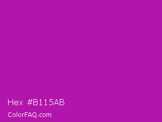 Hex #b115ab Color is a normal magenta color and the nearest color is Heliotrope Magenta #aa00bb. Hex code #b115ab and RGB value is rgb(177,21,171). In RGB color space, this color is composed of 69% red, 8% green, 67% blue, In CMYK color space, this color is composed of 0% cyan, 88% magenta, 3% yellow , 31% black , In HSL color space, this color has a hue angle of 302° , 79% saturation and 39% lightness.