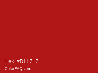 Hex #b11717 Color is a normal red color and the nearest color is Carnelian #b31b1b. Hex code #b11717 and RGB value is rgb(177,23,23). In RGB color space, this color is composed of 69% red, 9% green, 9% blue, In CMYK color space, this color is composed of 0% cyan, 87% magenta, 87% yellow , 31% black , In HSL color space, this color has a hue angle of 0° , 77% saturation and 39% lightness.