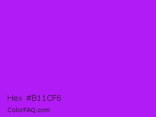 Hex #b11cf6 Color is a normal purple color and the nearest color is Veronica #a020f0. Hex code #b11cf6 and RGB value is rgb(177,28,246). In RGB color space, this color is composed of 69% red, 11% green, 96% blue, In CMYK color space, this color is composed of 28% cyan, 89% magenta, 0% yellow , 4% black , In HSL color space, this color has a hue angle of 281° , 92% saturation and 54% lightness.
