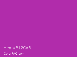 Hex #b12cab Color is a normal magenta color and the nearest color is Byzantine #bd33a4. Hex code #b12cab and RGB value is rgb(177,44,171). In RGB color space, this color is composed of 69% red, 17% green, 67% blue, In CMYK color space, this color is composed of 0% cyan, 75% magenta, 3% yellow , 31% black , In HSL color space, this color has a hue angle of 303° , 60% saturation and 43% lightness.