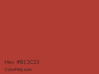 Hex #b13c33 Color is a normal red color and the nearest color is Medium Carmine #af4035. Hex code #b13c33 and RGB value is rgb(177,60,51). In RGB color space, this color is composed of 69% red, 24% green, 20% blue, In CMYK color space, this color is composed of 0% cyan, 66% magenta, 71% yellow , 31% black , In HSL color space, this color has a hue angle of 4° , 55% saturation and 45% lightness.