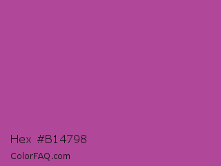 Hex #b14798 Color is a normal magenta color and the nearest color is Mulberry #c54b8c. Hex code #b14798 and RGB value is rgb(177,71,152). In RGB color space, this color is composed of 69% red, 28% green, 60% blue, In CMYK color space, this color is composed of 0% cyan, 60% magenta, 14% yellow , 31% black , In HSL color space, this color has a hue angle of 314° , 43% saturation and 49% lightness.