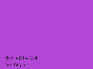Hex #b147d4 Color is a normal purple color and the nearest color is Medium Orchid #ba55d3. Hex code #b147d4 and RGB value is rgb(177,71,212). In RGB color space, this color is composed of 69% red, 28% green, 83% blue, In CMYK color space, this color is composed of 17% cyan, 67% magenta, 0% yellow , 17% black , In HSL color space, this color has a hue angle of 285° , 62% saturation and 55% lightness.