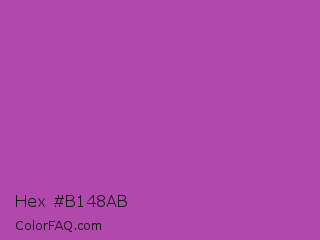 Hex #b148ab Color is a normal magenta color and the nearest color is Purpureus #9a4eae. Hex code #b148ab and RGB value is rgb(177,72,171). In RGB color space, this color is composed of 69% red, 28% green, 67% blue, In CMYK color space, this color is composed of 0% cyan, 59% magenta, 3% yellow , 31% black , In HSL color space, this color has a hue angle of 303° , 42% saturation and 49% lightness.