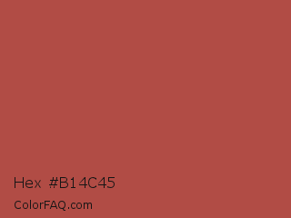 Hex #b14c45 Color is a normal red color and the nearest color is Apple Blossom #af4d43. Hex code #b14c45 and RGB value is rgb(177,76,69). In RGB color space, this color is composed of 69% red, 30% green, 27% blue, In CMYK color space, this color is composed of 0% cyan, 57% magenta, 61% yellow , 31% black , In HSL color space, this color has a hue angle of 4° , 44% saturation and 48% lightness.