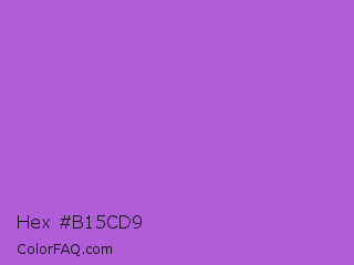 Hex #b15cd9 Color is a light purple color and the nearest color is Medium Orchid #ba55d3. Hex code #b15cd9 and RGB value is rgb(177,92,217). In RGB color space, this color is composed of 69% red, 36% green, 85% blue, In CMYK color space, this color is composed of 18% cyan, 58% magenta, 0% yellow , 15% black , In HSL color space, this color has a hue angle of 281° , 62% saturation and 61% lightness.