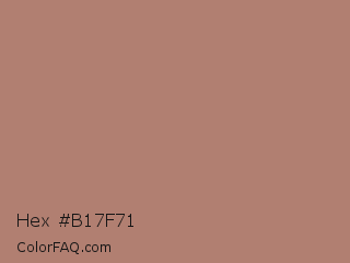 Hex #b17f71 Color is a normal red color and the nearest color is Light Taupe #b38b6d. Hex code #b17f71 and RGB value is rgb(177,127,113). In RGB color space, this color is composed of 69% red, 50% green, 44% blue, In CMYK color space, this color is composed of 0% cyan, 28% magenta, 36% yellow , 31% black , In HSL color space, this color has a hue angle of 13° , 29% saturation and 57% lightness.