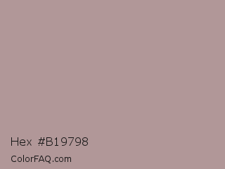 Hex #b19798 Color is a light red color and the nearest color is Del Rio #b09a95. Hex code #b19798 and RGB value is rgb(177,151,152). In RGB color space, this color is composed of 69% red, 59% green, 60% blue, In CMYK color space, this color is composed of 0% cyan, 15% magenta, 14% yellow , 31% black , In HSL color space, this color has a hue angle of 358° , 14% saturation and 64% lightness.