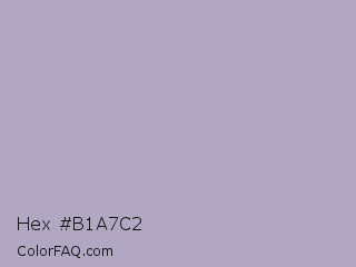 Hex #b1a7c2 Color is a light violet color and the nearest color is London Hue #bea6c3. Hex code #b1a7c2 and RGB value is rgb(177,167,194). In RGB color space, this color is composed of 69% red, 65% green, 76% blue, In CMYK color space, this color is composed of 9% cyan, 14% magenta, 0% yellow , 24% black , In HSL color space, this color has a hue angle of 262° , 18% saturation and 71% lightness.