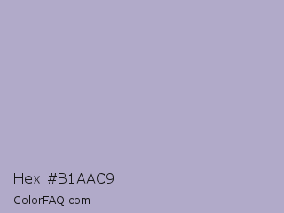 Hex #b1aac9 Color is a light indigo color and the nearest color is Logan #aaa9cd. Hex code #b1aac9 and RGB value is rgb(177,170,201). In RGB color space, this color is composed of 69% red, 67% green, 79% blue, In CMYK color space, this color is composed of 12% cyan, 15% magenta, 0% yellow , 21% black , In HSL color space, this color has a hue angle of 254° , 22% saturation and 73% lightness.