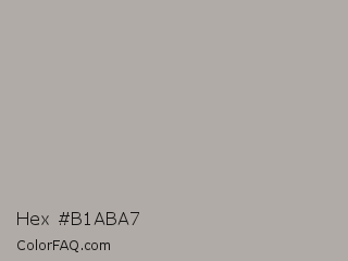Hex #b1aba7 Color is a light orange color and the nearest color is Silver Chalice #acacac. Hex code #b1aba7 and RGB value is rgb(177,171,167). In RGB color space, this color is composed of 69% red, 67% green, 65% blue, In CMYK color space, this color is composed of 0% cyan, 3% magenta, 6% yellow , 31% black , In HSL color space, this color has a hue angle of 24° , 6% saturation and 67% lightness.