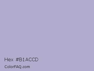 Hex #b1accd Color is a light indigo color and the nearest color is Logan #aaa9cd. Hex code #b1accd and RGB value is rgb(177,172,205). In RGB color space, this color is composed of 69% red, 67% green, 80% blue, In CMYK color space, this color is composed of 14% cyan, 16% magenta, 0% yellow , 20% black , In HSL color space, this color has a hue angle of 249° , 25% saturation and 74% lightness.