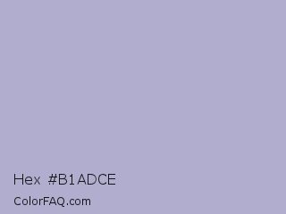 Hex #b1adce Color is a light indigo color and the nearest color is Logan #aaa9cd. Hex code #b1adce and RGB value is rgb(177,173,206). In RGB color space, this color is composed of 69% red, 68% green, 81% blue, In CMYK color space, this color is composed of 14% cyan, 16% magenta, 0% yellow , 19% black , In HSL color space, this color has a hue angle of 247° , 25% saturation and 74% lightness.