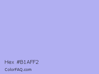 Hex #b1aff2 Color is a very light indigo color and the nearest color is Maximum Blue Purple #acace6. Hex code #b1aff2 and RGB value is rgb(177,175,242). In RGB color space, this color is composed of 69% red, 69% green, 95% blue, In CMYK color space, this color is composed of 27% cyan, 28% magenta, 0% yellow , 5% black , In HSL color space, this color has a hue angle of 242° , 72% saturation and 82% lightness.