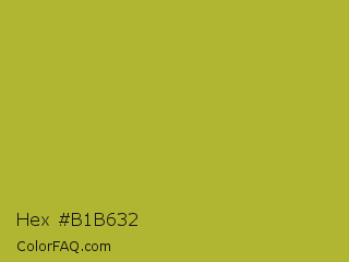 Hex #b1b632 Color is a normal yellow color and the nearest color is Android Green #a4c639. Hex code #b1b632 and RGB value is rgb(177,182,50). In RGB color space, this color is composed of 69% red, 71% green, 20% blue, In CMYK color space, this color is composed of 3% cyan, 0% magenta, 73% yellow , 29% black , In HSL color space, this color has a hue angle of 62° , 57% saturation and 45% lightness.